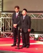 3人でステージにあがりました。副理事長が盾をもらった後に,僕と