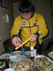 近所のますみさんの家に行きました。チンジャオロースの材料を切って